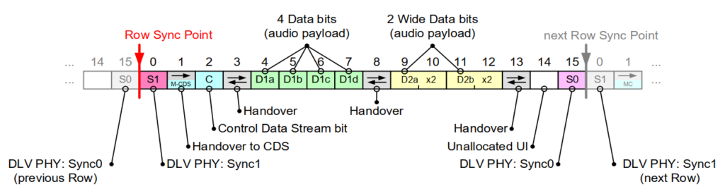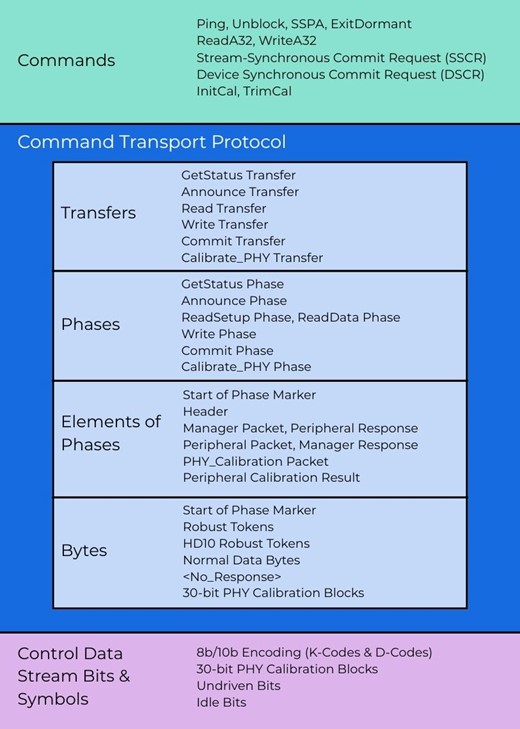 In SWI3S, the control data is transported in a more flexible row-based transport scheme and there isn’t a ‘frame’ structure. That is, the amount of bits dedicated for control data is more configurable and can change dynamically while the traffic is running. A full transport layer is implemented for this stream, allowing for more complex configuration operations. Figure 2 illustrates the full details of this command transport protocol.