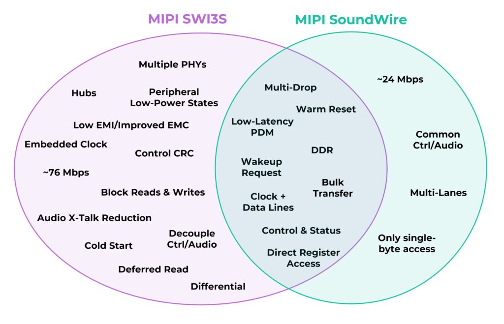 SWI3S shares many characteristics with SoundWire, and it also introduces distinct features. Figure 5 provides a visual comparison of each interface’s capabilities, making it easy to see where they align and where they differ.